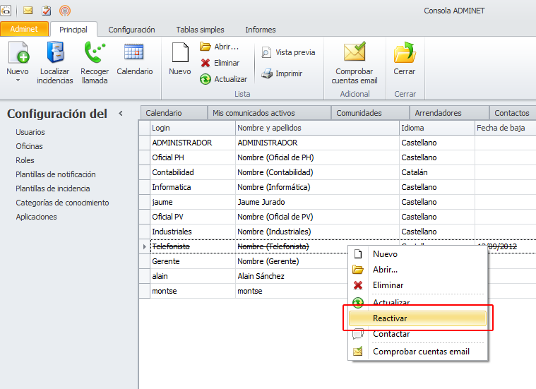 Al dar de baja un usuario, se eliminarán todas sus cuentas de correo. Una vez desactivado se puede volver activar desde la opción ‘Reactivar’.