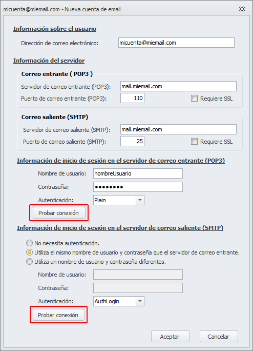 En la ficha de configuración de la cuenta de e-mail, se ha añadido la opción de ‘Probar conexión’. Esto permite realizar una comprobación de la configuración tanto del correo entrante como del saliente.