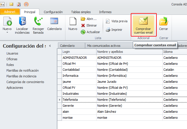 En la lista de usuarios, se ha añadido la opción ‘Comprobar cuentas e-mail’ que realiza la misma comprobación pero para todas las cuentas de todos los usuarios.