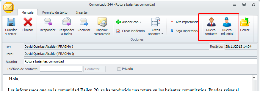 Desde la ficha del comunicado, se añade la opción de dar de alta contactos e industriales.