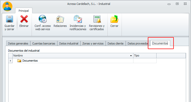 En la ficha del industrial, se ha añadido una nueva pestañas que permite añadir documentos adjuntos al industrial.