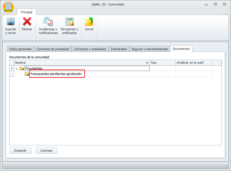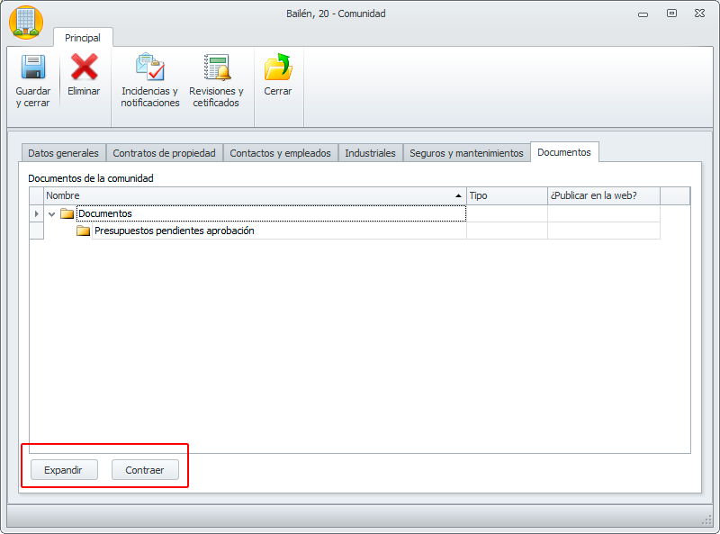 En las fichas de la comunidad, arrendador y macro-comunidad, se ha añadido dos botones en la pestaña documentos que permite contraer o expandir el árbol de documentos.
