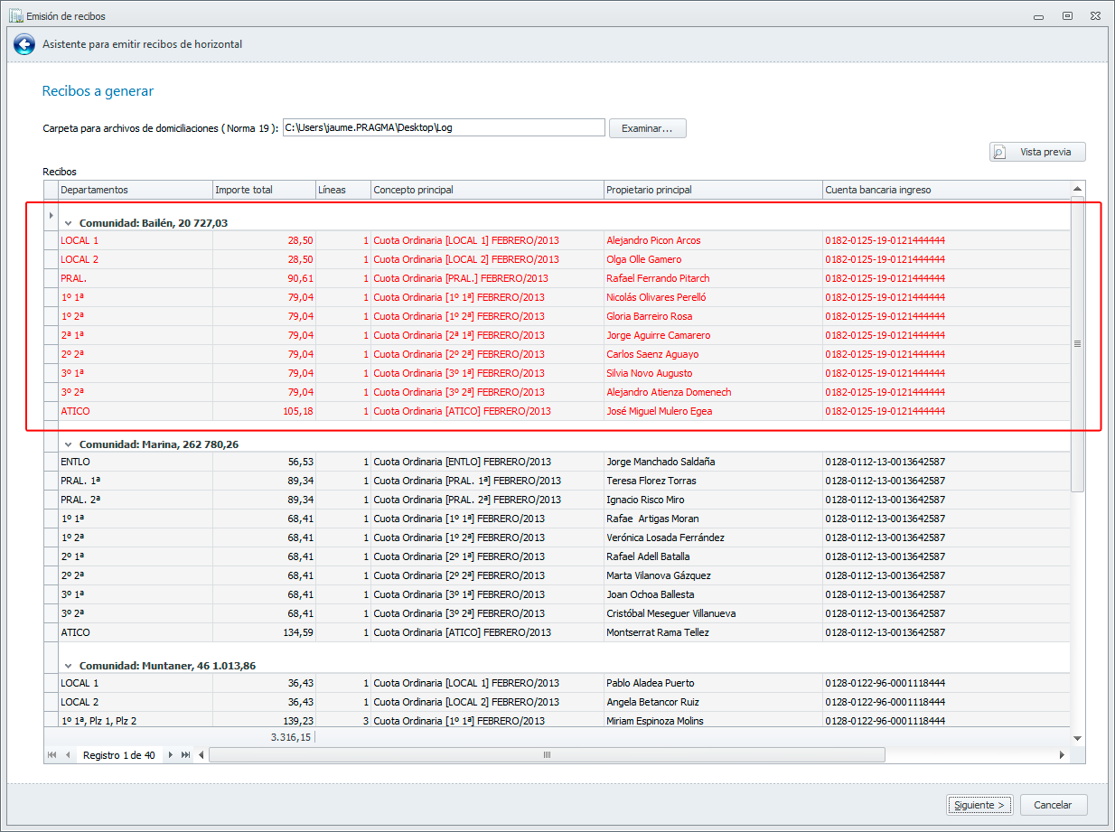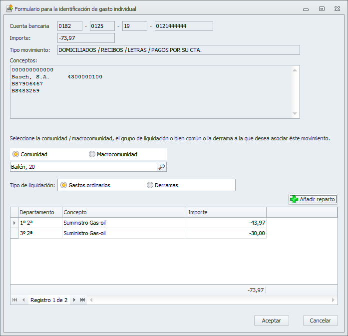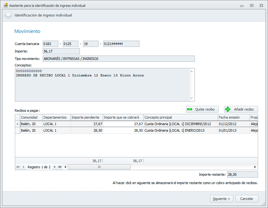 Se mejora el asistente de identificación de ingreso individual para que permita repartir el importe total del movimiento entre los recibos pendientes a cobrar.