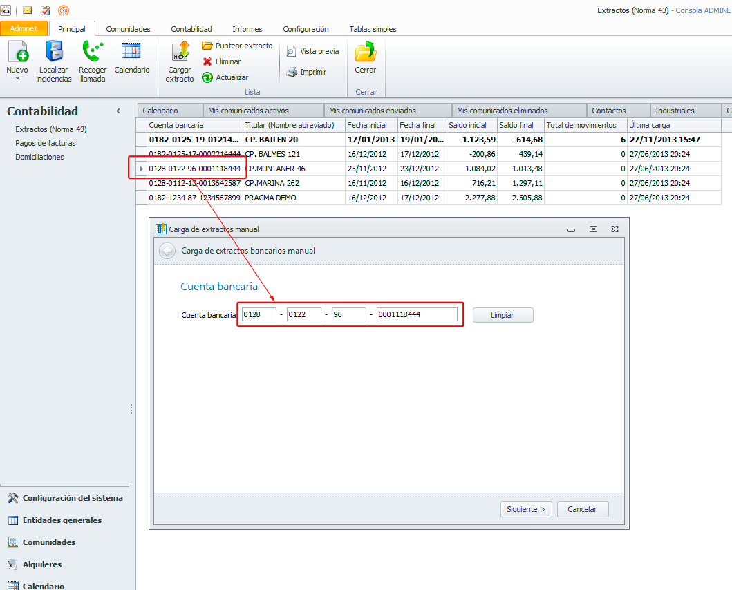 Al realizar la carga de extractos (norma43) de forma manual, si previamente hemos seleccionado un extracto de la lista, el número de cuenta vendrá informado.