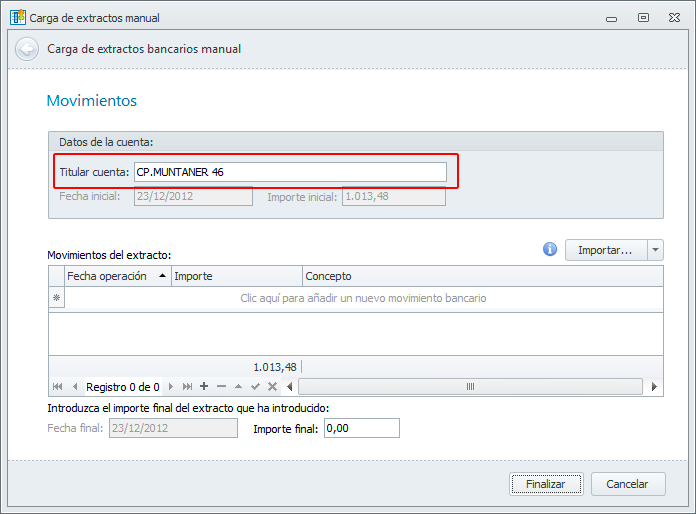 En la ficha de introducción manual de extractos (norma43), se permite la modificación del campo ‘Titular de la cuenta’.
