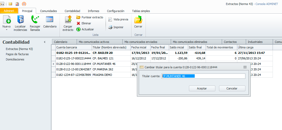Desde la lista de extractos (norma43), haciendo clic derecho sobre un registro en concreto podemos cambiar la descripción del titular. Opción ‘Cambiar titular’. Útil cuando el nombre del titular no viene informado en el archivo bancario de norma43.