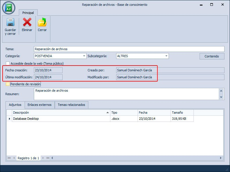 En la ficha base datos de conocimiento, se han añadido los campos fecha de creación, creado por, fecha última modificación, modificado por, y un chec de pendiente de revisión.