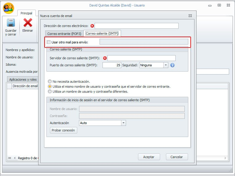 En la configuración del correo electrónico del usuario, en el apartado SMTP, se añade un nuevo campo: “Usar otro mail para envío”. Si se informa este campo, el envío se realiza desde esta cuenta con lo que los correos se responderán también a esta cuenta.