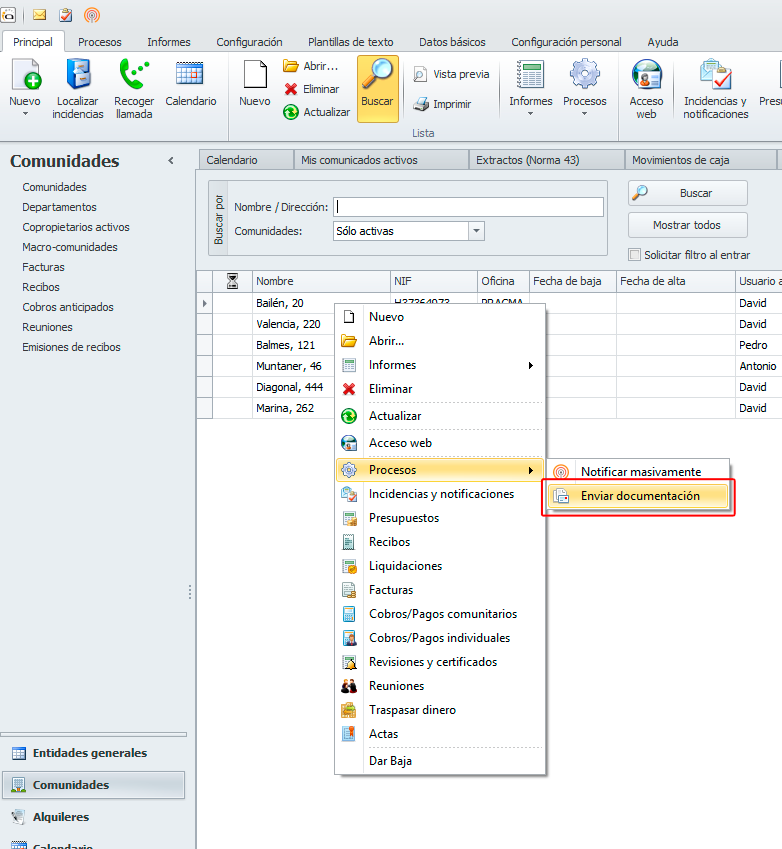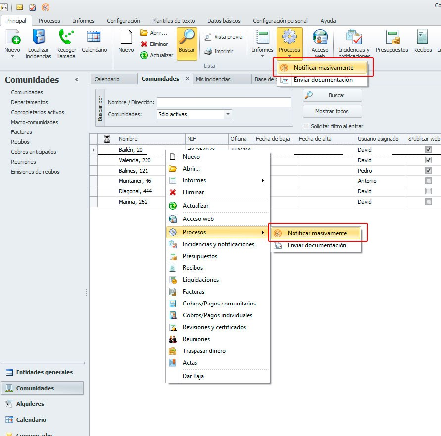 En el menú contextual de la lista de comunidades y macro-comunidades se ha añadido un nuevo apartado: ‘Procesos’, que dentro se ha colocado la opción de “Notificar masivamente”.