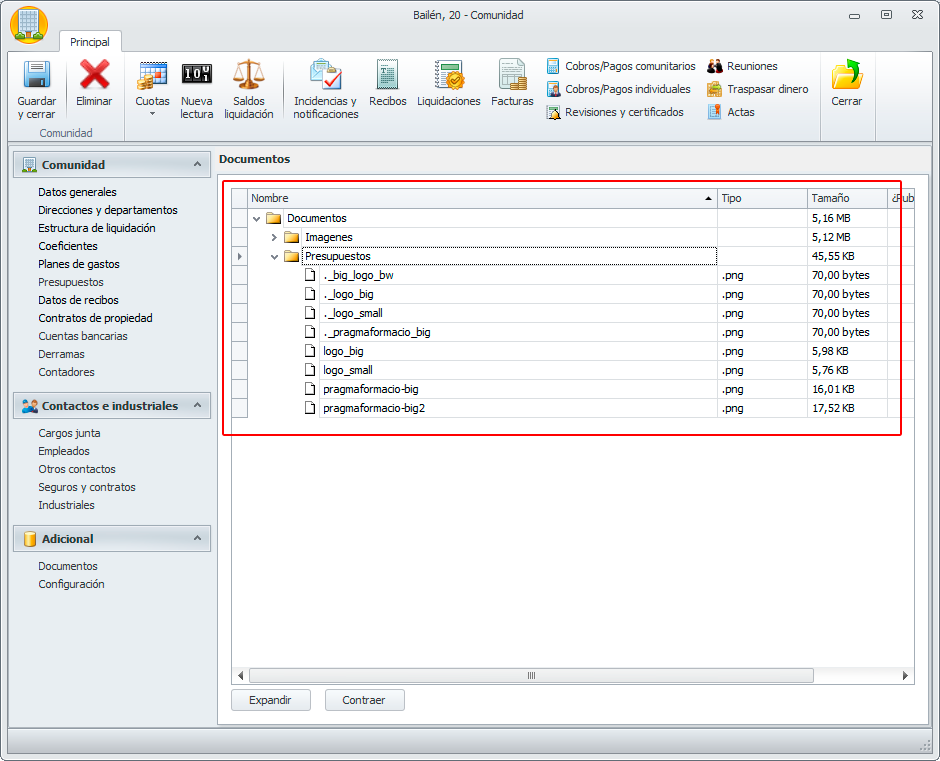 Árbol de documentos. Podemos ver un ejemplo en la ficha de la comunidad, el apartado “Documentos” donde se muestran los ficheros de la comunidad en forma de árbol.