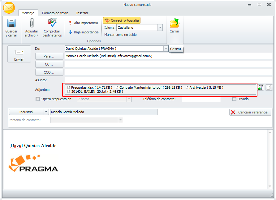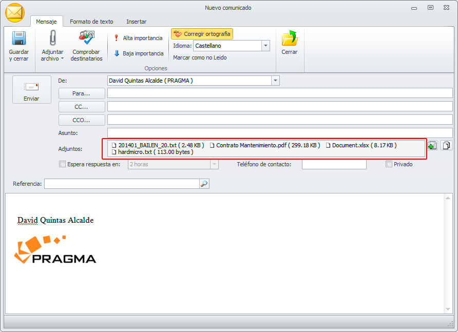 Control de Adjuntos similar a Outlook. Podemos ver un ejemplo en la ficha de envío de un comunicado. Es un control parecido a una caja de texto donde vamos añadiendo los documentos a adjuntar al comunicado.