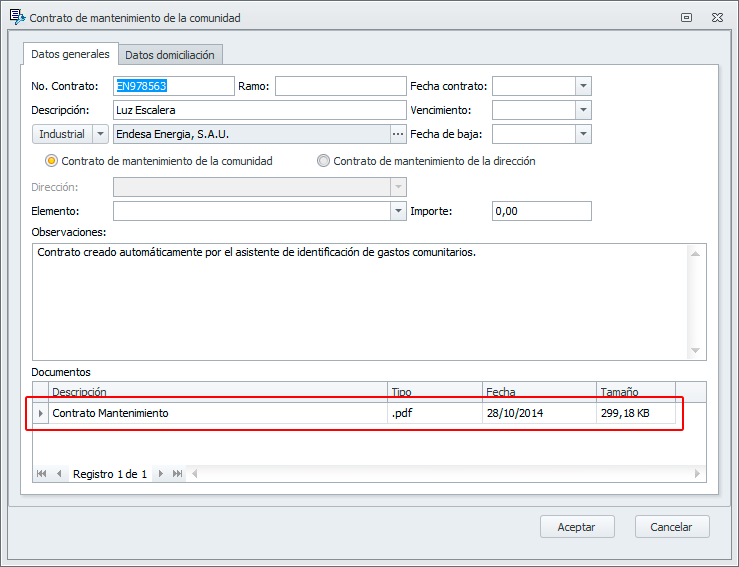 Grid de documentos. Vemos un ejemplo en la ficha de un contrato de mantenimiento o póliza de seguro donde se muestran los documentos asociados en forma de lista.