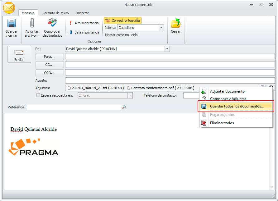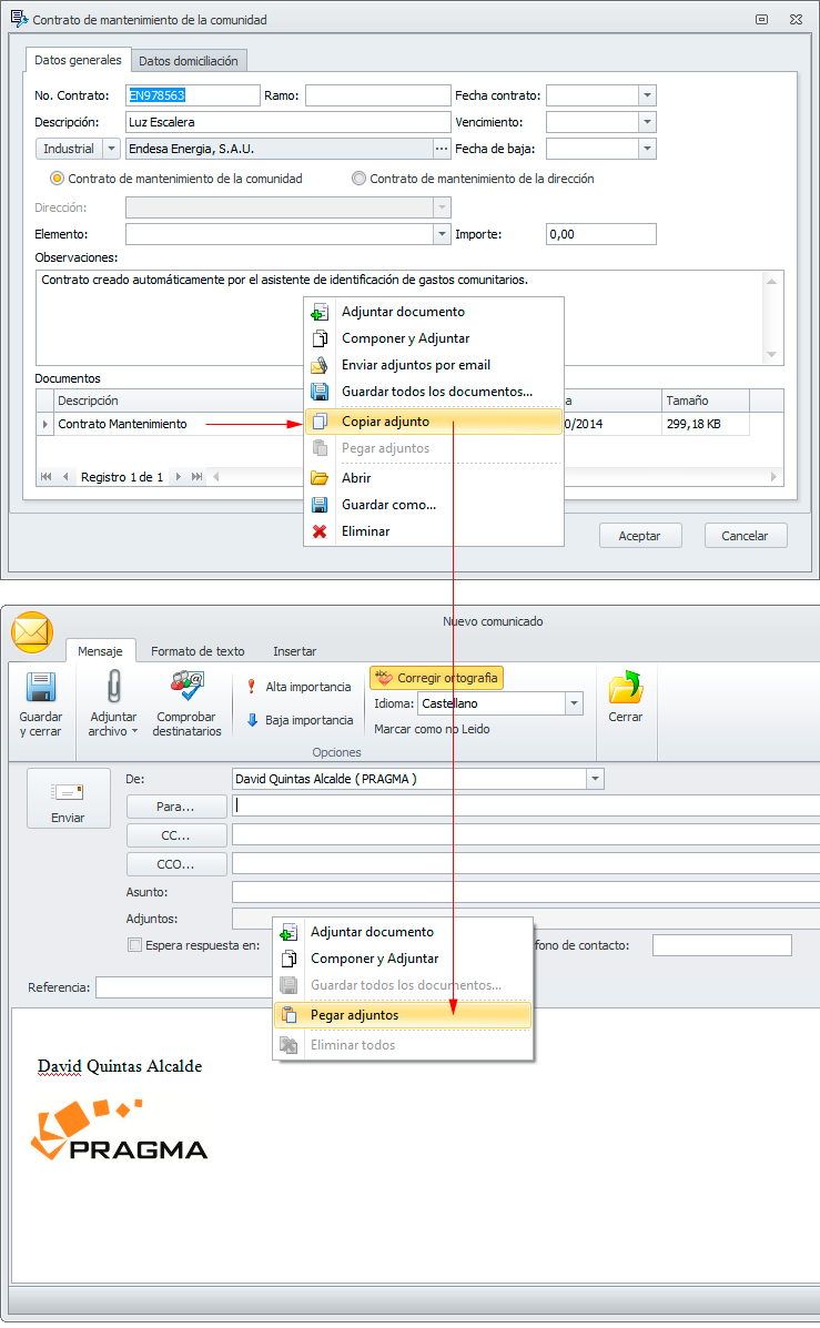 Copiar y pegar. Por ejemplo, podemos copiar un documento adjunto en un mantenimiento y pegarlo en un comunicado. Hay total libertad para copiar y pegar documentos entre los diferentes documentos adjuntos en toda la aplicación.