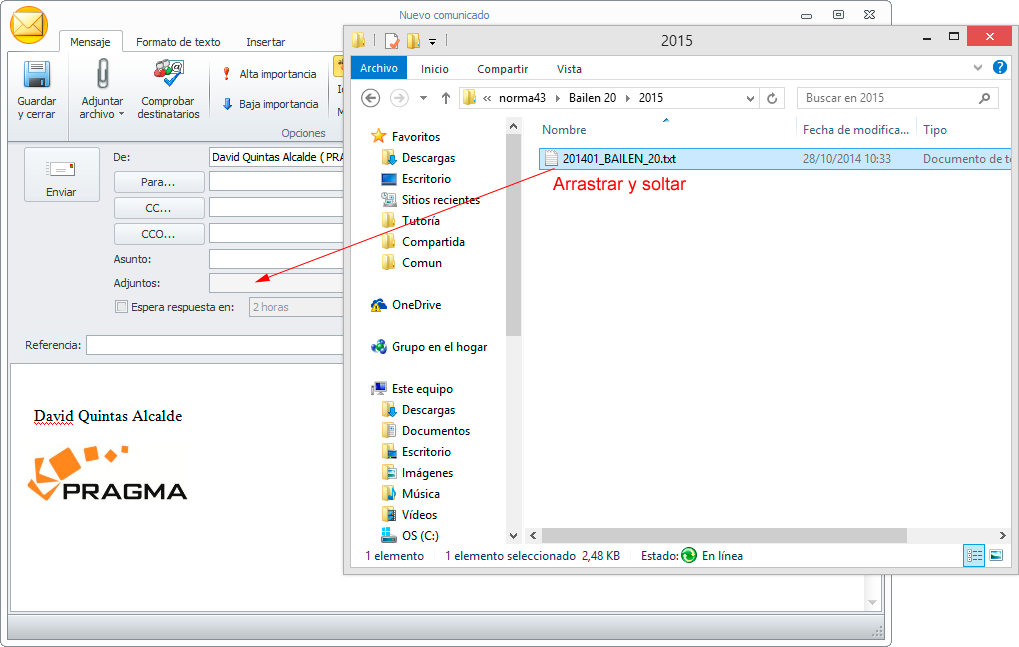 Arrastrar y soltar. Desde cualquier carpeta de Windows o desde el escritorio, podemos arrastrar el documento hacia Adminet. El documento se adjunta automáticamente.
