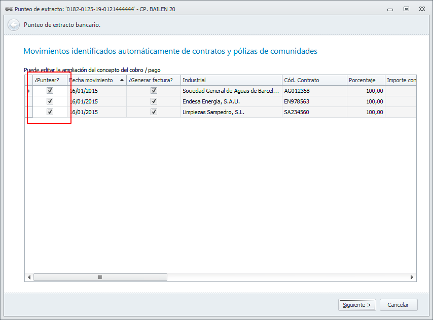 En la identificación de movimientos bancarios por Norma 43, en el primer paso de identificación automática a través de pólizas, se ha añadido una nueva columna con una casilla de verificación, donde podemos especificar si se desea contabilizar los mantenimientos identificados o no.