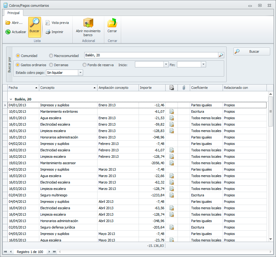 Se mejora la visualización de los listados de cobros pagos individual / comunitarios. Ahora salen agrupados por grupo de liquidación o bien común. Esto permite ver de una forma más clara la información.