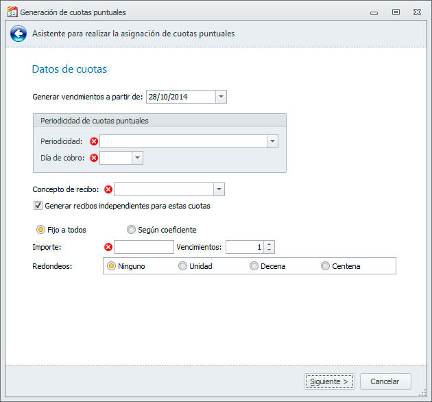 Se permite crear cuotas puntuales de recibos ordinarios para fechas en concreto. Esta opción permite girar recibos en fechas diferentes a la cuota ordinaria establecida.