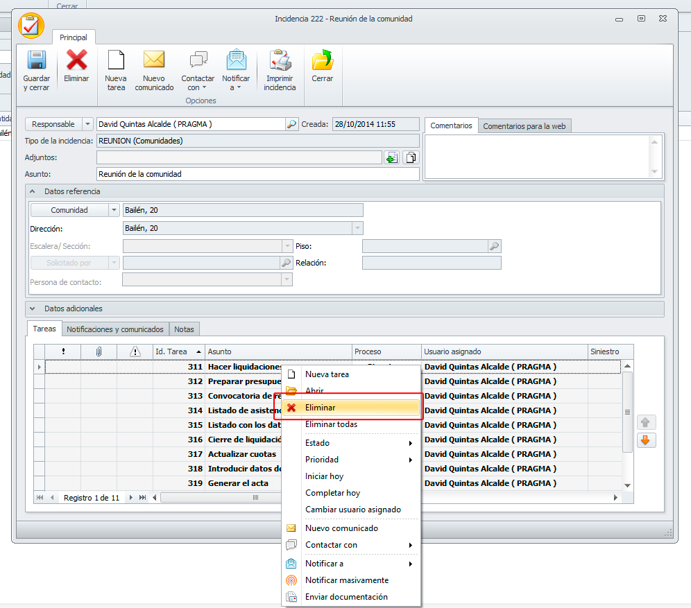 En las incidencias de tipo reunión se permite borrar las tareas asociadas a procesos. El programa avisa que si la eliminamos, no la podremos añadir posteriormente.