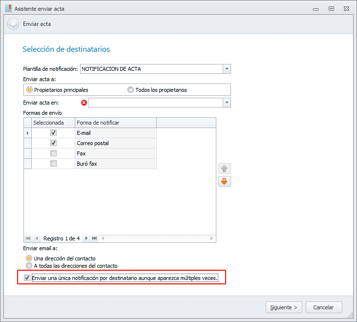 En los envíos de actas de la reunión, se añade una casilla de verificación donde podemos indicar que se realice un único envío por propietario, de forma tal que si hay un propietario que es dueño de múltiples propiedades dentro de la misma comunidad, se le envíe únicamente un acta y no tantas como propiedades tenga.