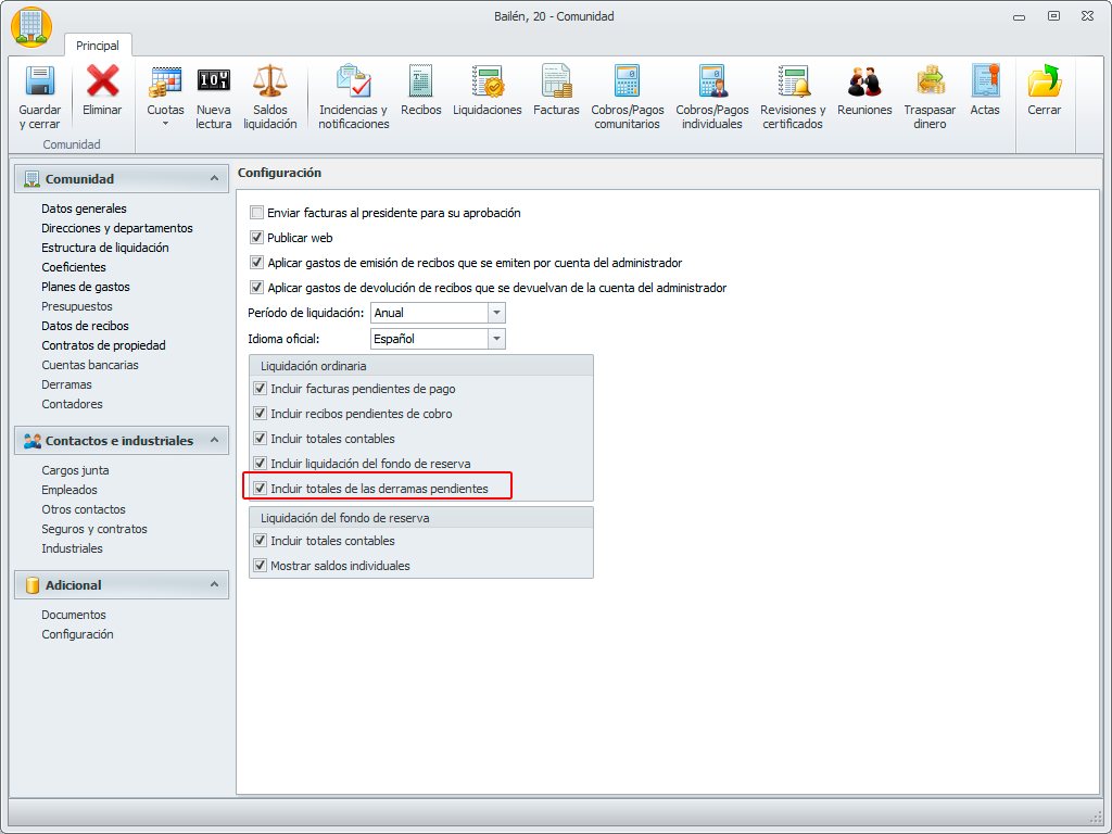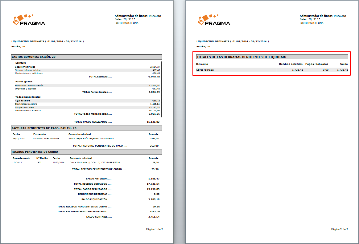 Vemos un ejemplo de liquidación con los totales de las derramas aprobadas y no liquidadas.
