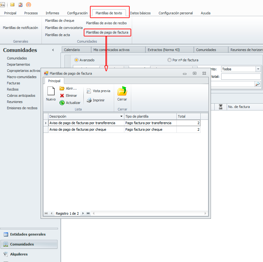 Para gestionar o modificar las plantillas que se utilizan para notificar el pago de facturas, se ha añadido una nueva opción “Plantillas de pago de factura” dentro de la pestaña de opciones “Plantillas de texto”.