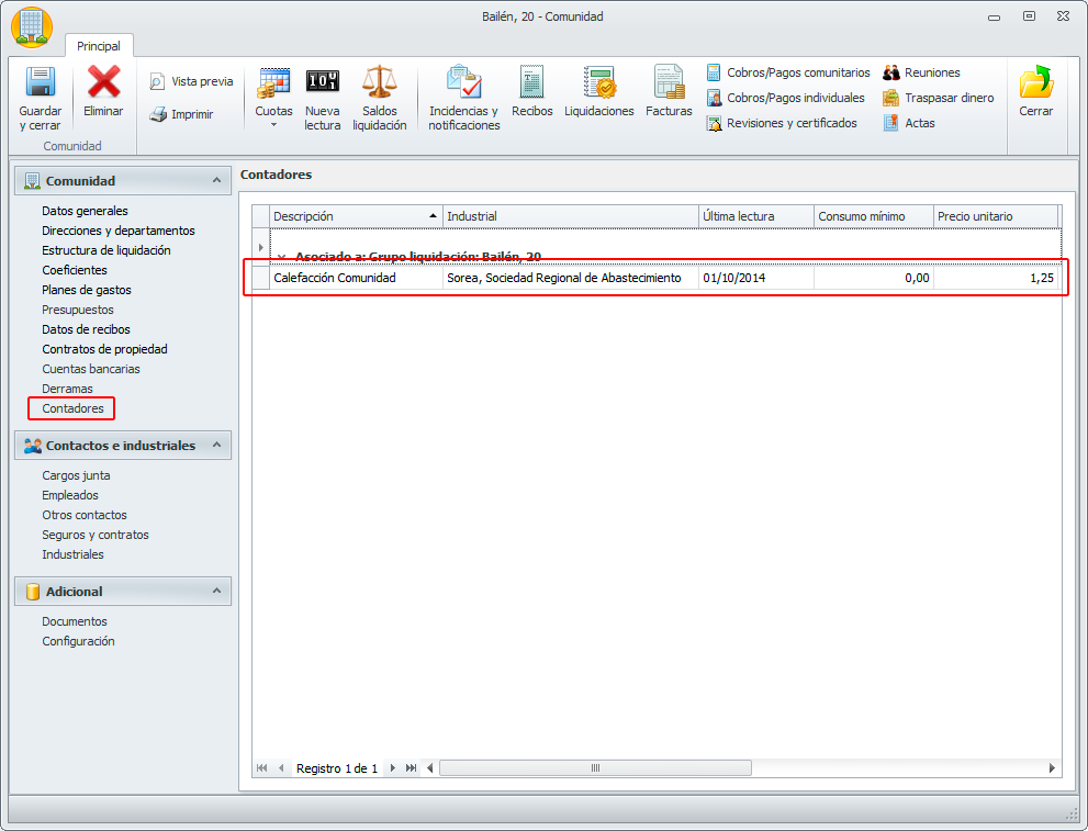 Los contadores, se liquidan dentro de la liquidación ordinaria, en un bloque independiente. Identificando por cada uno de los contadores, todos los gastos e ingresos que se han producido asociados al contador.