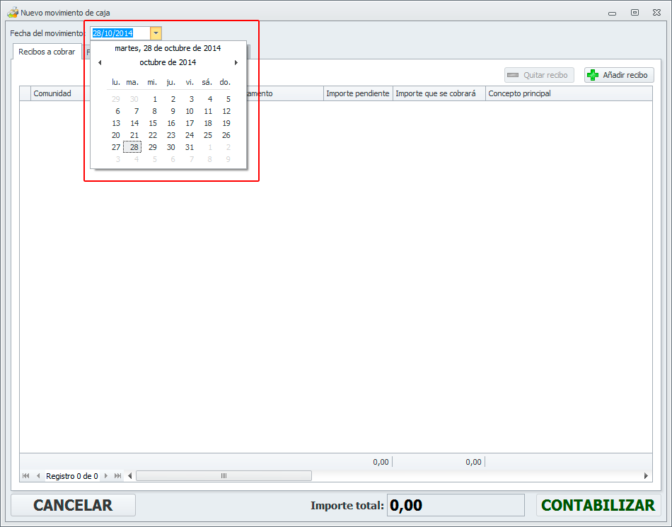 Al contabilizar un movimiento de caja, se puede modificar la fecha del movimiento pudiendo especificar una fecha anterior a la fecha actual.