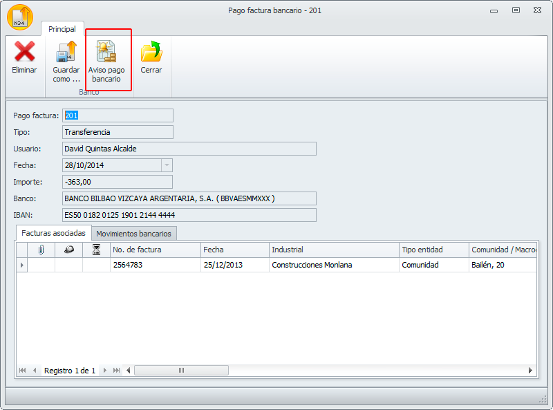 Desde la ficha de pago factura bancario, se ha añadido un nuevo botón que permite re-enviar al industrial el aviso de pago de las facturas.