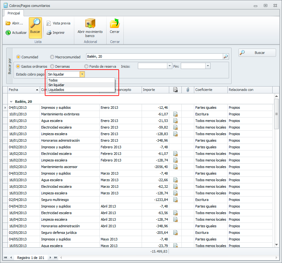En los listados de cobros pagos comunitarios e individuales, se ha añadido un desplegable con las opciones: ‘Pendientes de liquidar’, ‘Liquidados’ y ‘Todos’. De esta forma, se pueden consultar cobros pagos que han sido liquidados anteriormente.