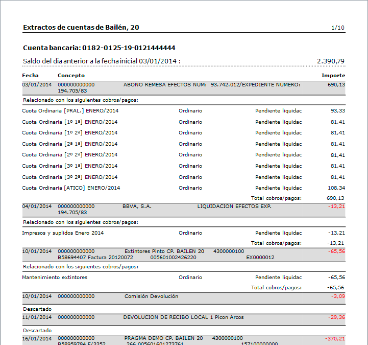 Se añade un nuevo informe para comunidades y macro comunidades donde permite imprimir los movimientos bancarios de una comunidad. Este informe detalla los cobros pagos asociados a los movimientos del extracto bancario (Norma 43).