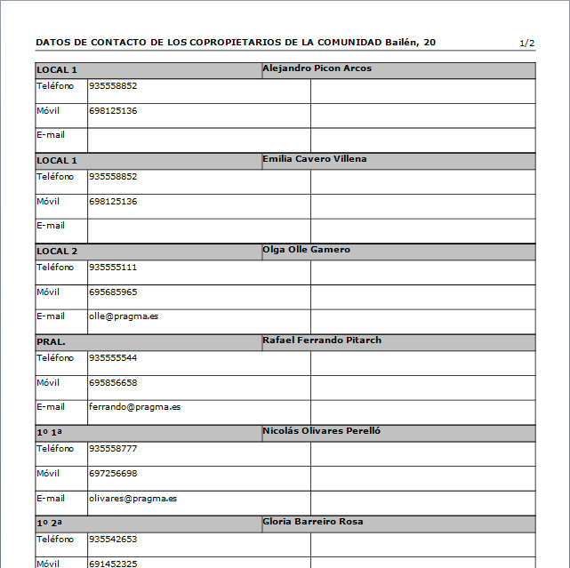En el apartado informes ubicado en la lista de comunidades y macro-comunidades, se ha añadido un nuevo informe: ‘Datos de contacto de los propietarios’. Este informe es el mismo que se imprime para llevar a la reunión y los propietarios rectifiquen sus formas de contacto.