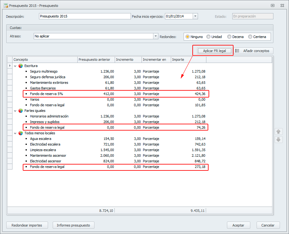En los presupuestos ordinarios, se añade un nuevo botón que permite añadir automáticamente el fondo de reserva legal al presupuesto. Por defecto el sistema establece el 5%, pero el usuario puede cambiar este valor. El cálculo se realiza en base al % informado del total de cada uno de los coeficientes que intervienen en el presupuesto.