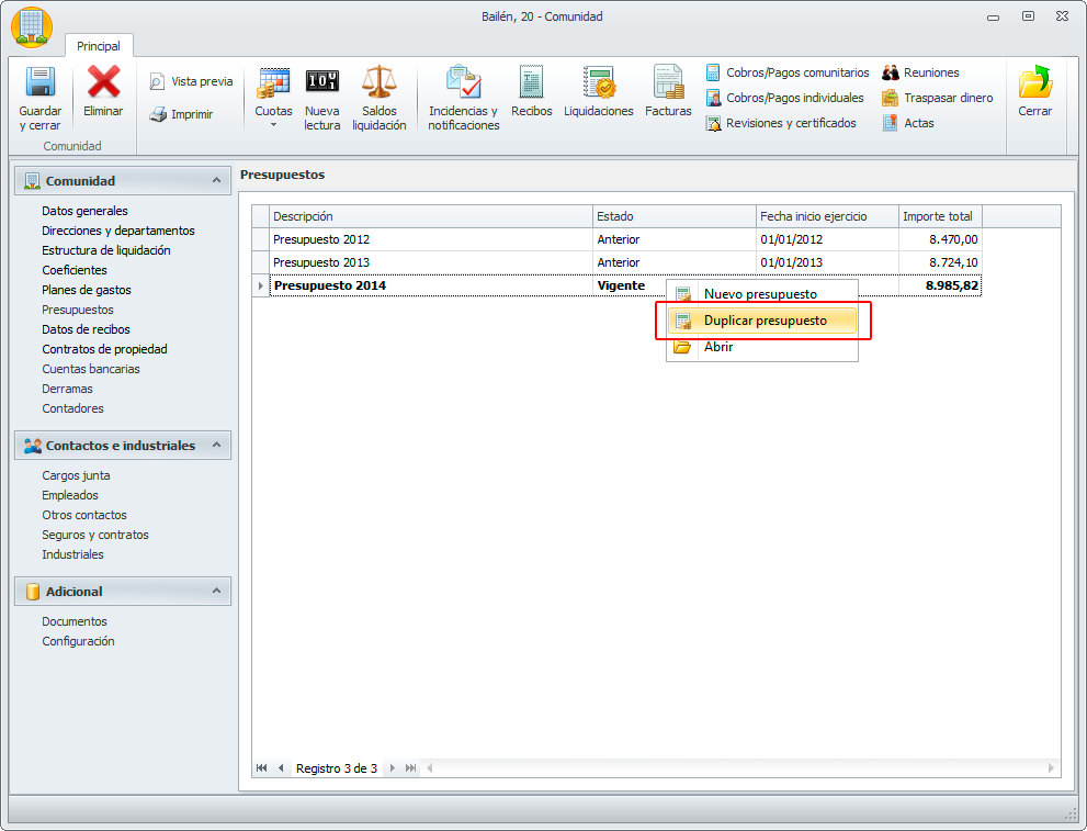 Se permite duplicar los presupuestos ordinarios independientemente de cual sea su estado. Haciendo clic con el botón derecho del presupuesto a duplicar y seleccionamos la opción “Duplicar presupuesto”.