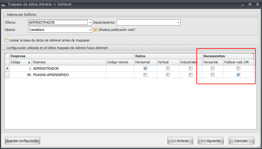 En el proceso de traspaso de Adminis->Adminet se incluye la posibilidad de traspasar los documentos asociados a las comunidades de Adminis. Esta opción por defecto está deshabilitada, si se quiere activar, debemos realizarlo desde el programa de “TraspasaAdminis”. Las clases en Adminis se convierten en carpetas dentro la sección ‘Documentos’ en la ficha de la comunidad de Adminet. En la configuración del proceso de traspaso, podemos indicar si los documentos que se traspasan a Adminet, automáticamente se publicarán en el portal Admiweb-24h y así queden disponibles para los propietarios y presidentes.