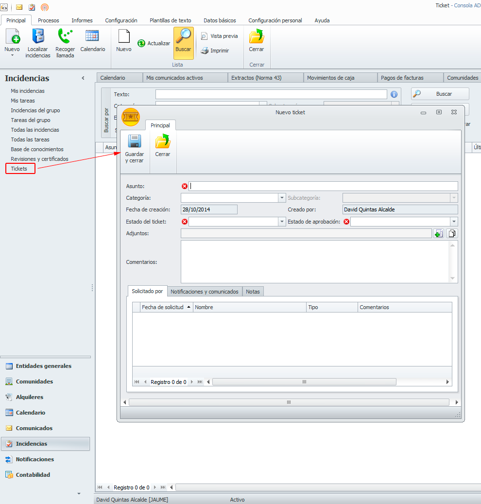 Se ha desarrollado un nuevo módulo para gestionar solicitudes de clientes: Tickets. La lista de tickets es accesible desde dentro del grupo “Incidencias”.