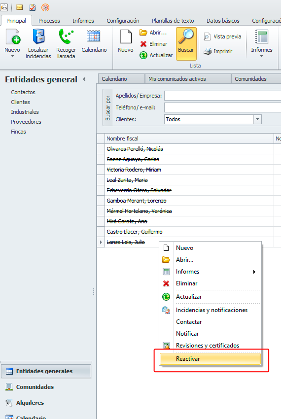 Nueva opción que permite reactivar clientes dados de baja, desde el menú contextual de la lista de clientes opción “Reactivar”. El sistema muestra un diálogo de confirmación antes de su reactivación.