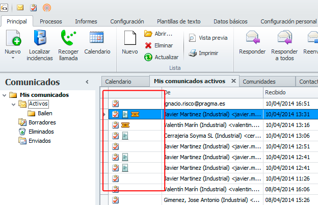 Se ha añadido una nueva columna en las listas de comunicados y notificaciones, que agrupa todos los iconos que indican si la notificación o el comunicado tiene adjuntos, si está asociado con incidencia, nivel de prioridad, si está asociado con recibo etc. De esta forma, se reduce el espacio de tener una columna para cada icono indicativo. Estas columnas individuales se mantienen en la lista pero se colocan al final de las columnas.