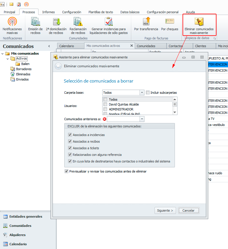 En la pestaña de procesos, se añade la opción de “Eliminar comunicados masivamente”. Este asistente permite a través de diversos filtros seleccionar los comunicados que se desean eliminar.