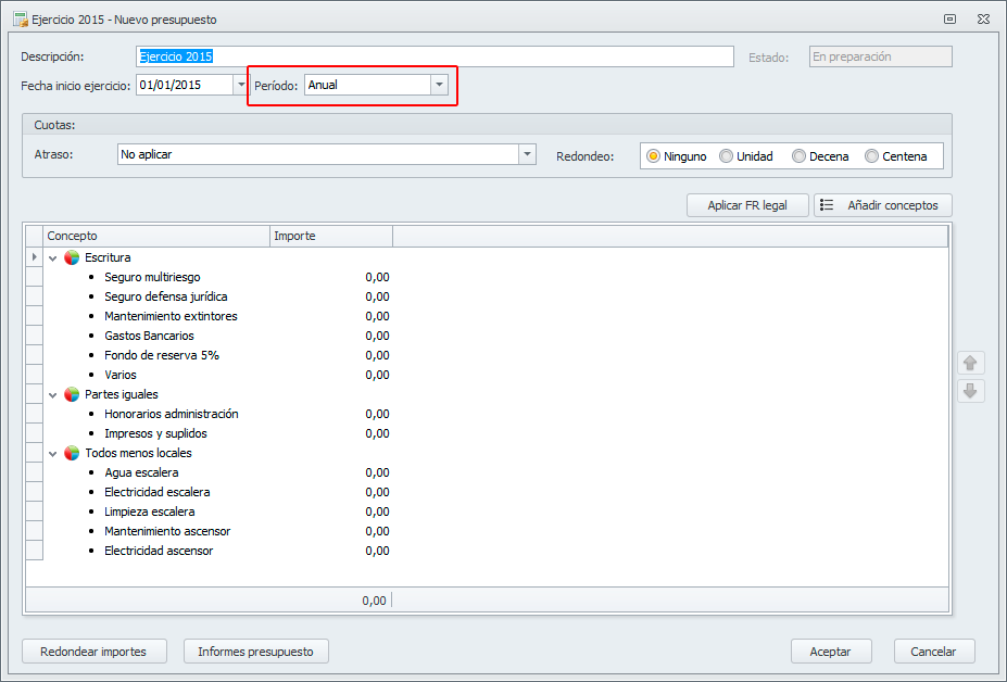En la ficha del presupuesto, se añade un nuevo campo “Período” que permite establecer el período del presupuesto ordinario.