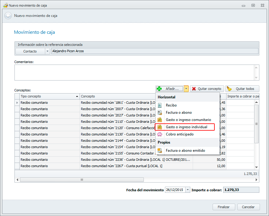Además de las operaciones que ya se permitían realizar desde caja, se ha añadido la posibilidad de entrar cobros y pagos individuales sin asociar con recibos.