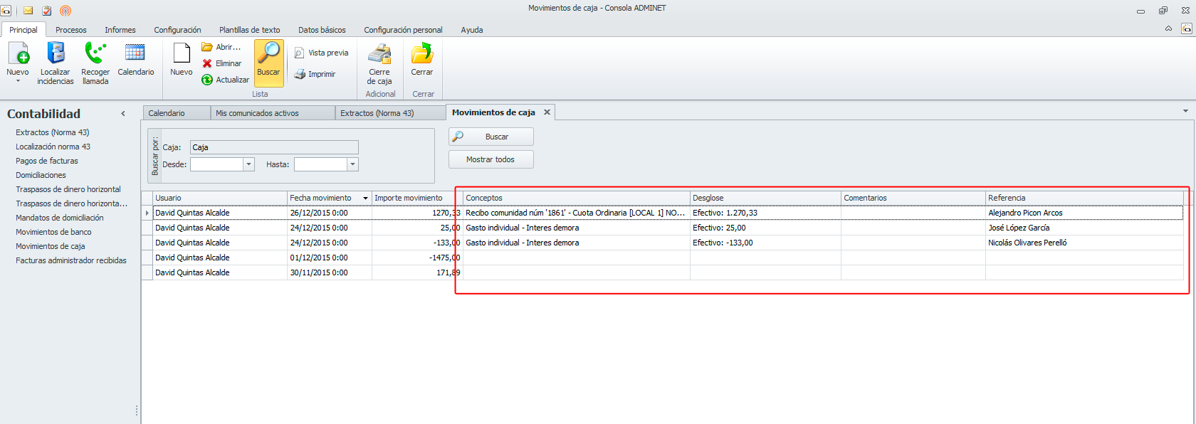 La lista de movimientos de caja se ha modificado, para mostrar los nuevos campos que se han introducido.