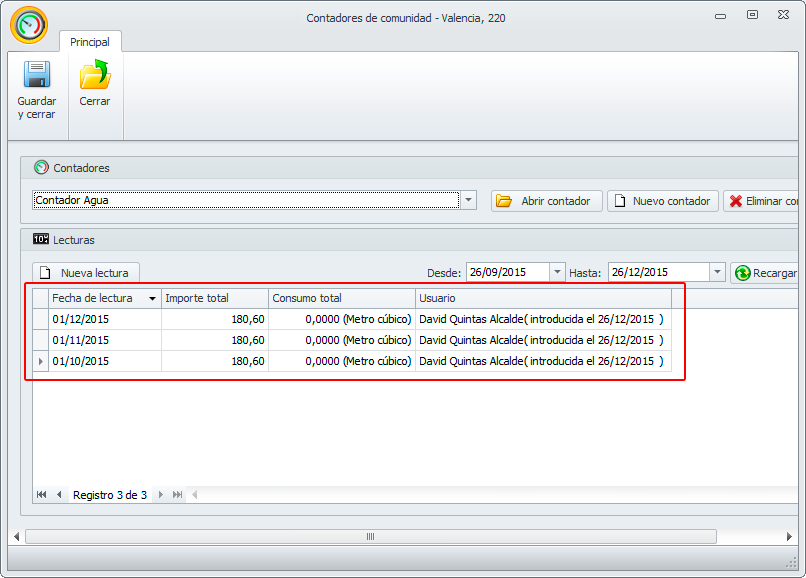 Mejoras en los contadores de consumos. El acceso a los contadores ya no se hace desde la ficha de la comunidad, se accede desde la lista de comunidades, botón derecho sobre la comunidad en cuestión y seleccionamos la opción de Contadores.