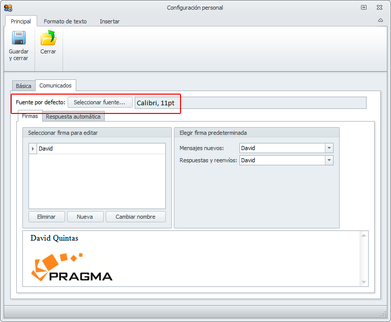 La fuente predeterminada de los comunicados se establece desde la configuración personal del usuario (Configuración personal->Configuración personal).