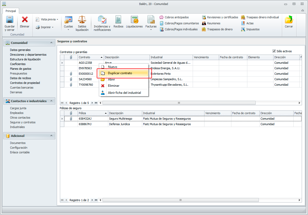 Nueva opción que permite duplicar un mantenimiento o una póliza de seguro, haciendo clic con el botón derecho del ratón y seleccionando la opción ‘Duplicar’. Mismo comportamiento en: Ficha de la comunidad, Ficha del arrendador, Ficha del cliente y Ficha del administrador.