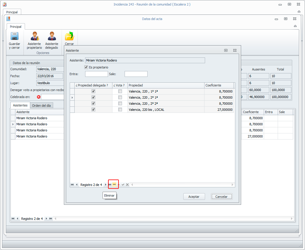 En la introducción de datos de la reunión, cuando un asistente viene en representación de múltiples propiedades, se puede eliminar una propiedad determinada, si necesidad de eliminar el asistente completo.