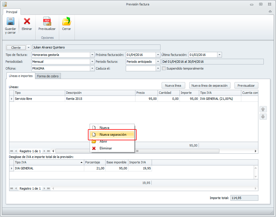 Al dar de alta nuevas líneas de previsiones o pre-facturas, se permite ahora la opción de dar de alta directamente una línea de separación.