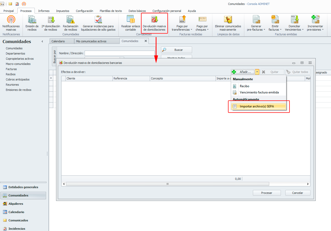 Devolución de recibos y vencimientos de facturas de forma masiva a través del fichero de devolución SEPA.