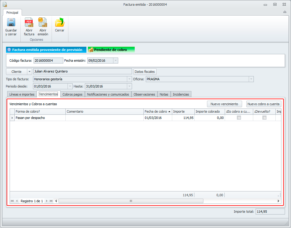 En la ficha de pre-factura y factura, se reordena la pestaña de vencimientos, ahora existe un único listado y se añade una columna donde indicamos los vencimientos cobrados a cuenta.