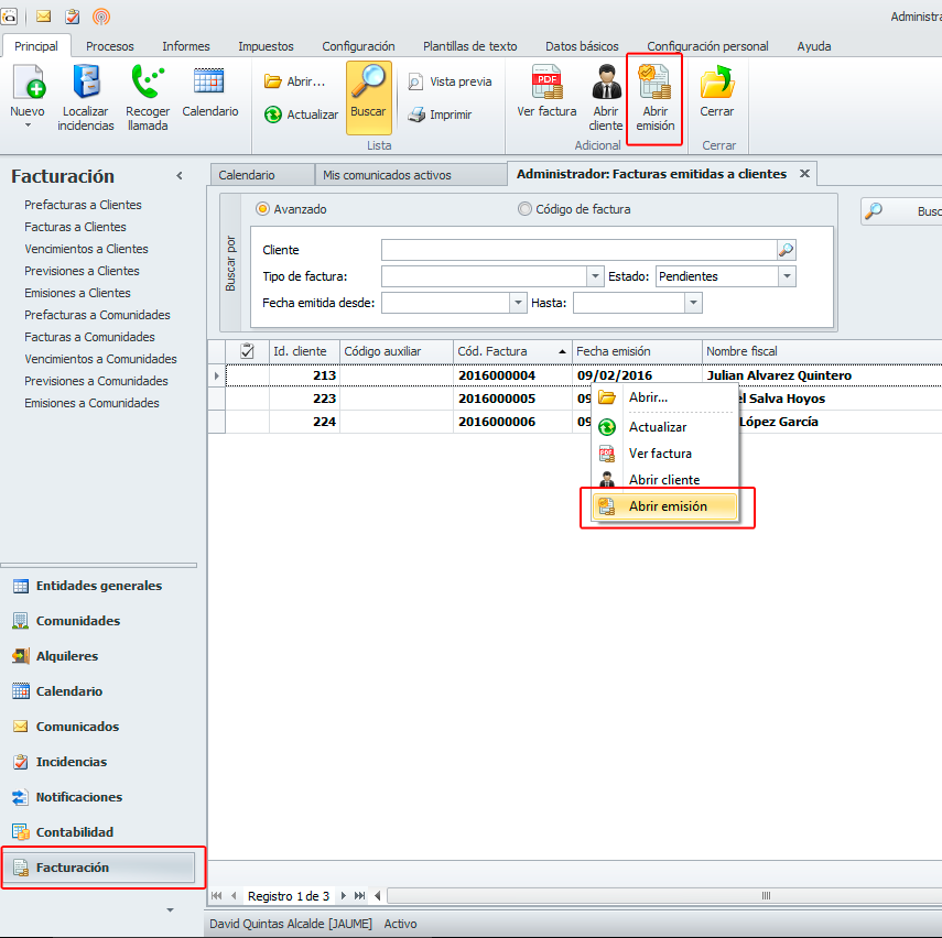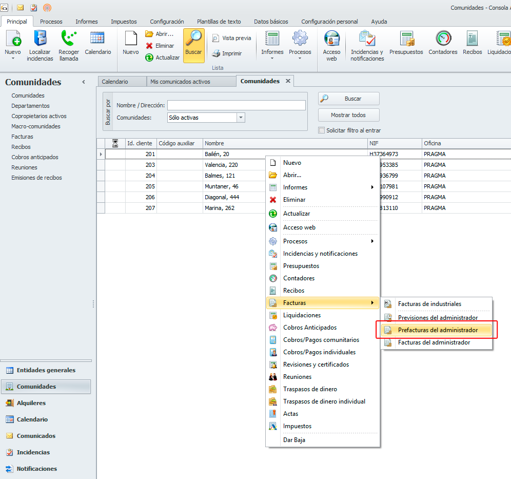 Desde la lista y ficha del cliente, comunidad y macrocomunidad, a través del botón facturas podíamos acceder a las previsiones y facturas, ahora se ha añadido una nueva opción para acceder a las pre-facturas.