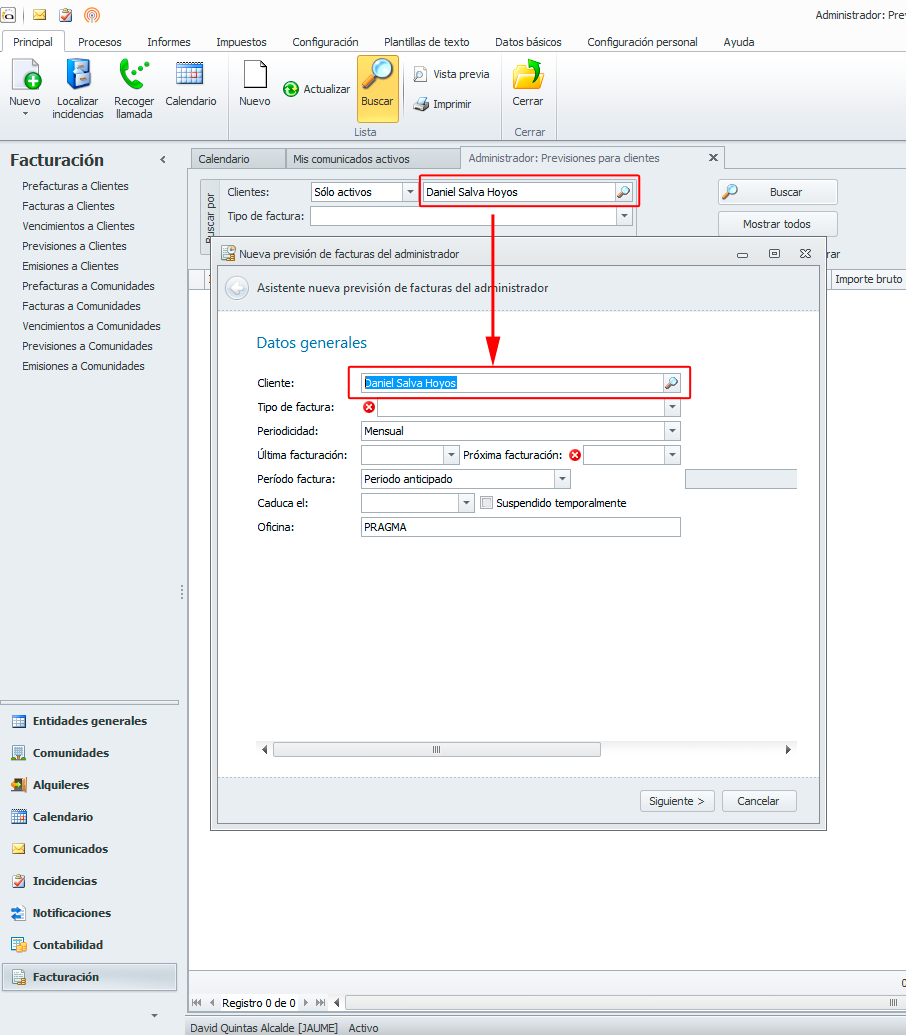 Si la lista de previsiones la tenemos filtrada por un cliente en específico, al dar de alta una nueva previsión, el asistente prefijará el cliente que teníamos en la lista.